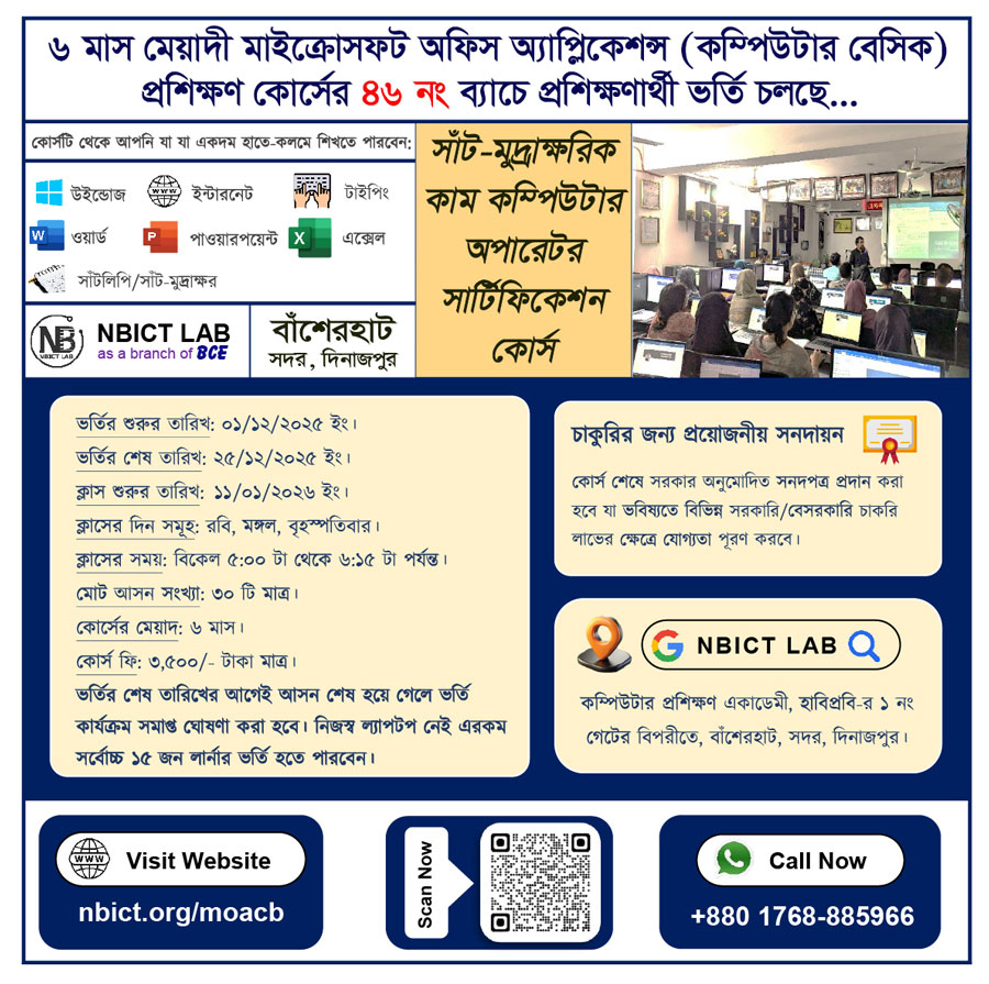 আগ্রহী প্রশিক্ষণার্থীদের অবগতির জন্য জানানো যাচ্ছে যে NBICT LAB কর্তৃক আয়োজিত এবং গণপ্রজাতন্ত্রী বাংলাদেশ সরকার অনুমোদিত BCE (NIJUS) কর্তৃক পরিচালিত ৬ মাস মেয়াদী মাইক্রোসফট অফিস অ্যাপ্লিকেশন্স (কম্পিউটার বেসিক) / সাঁট-মুদ্রাক্ষরিক …