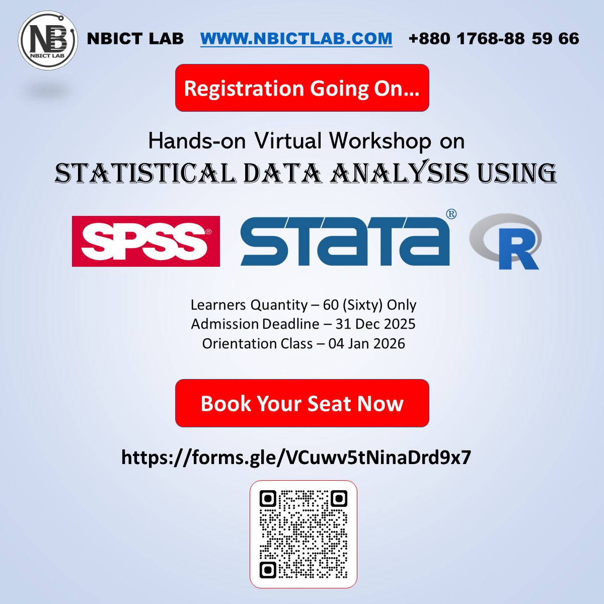 NBICT LAB – এর সার্বিক ব্যবস্থাপনায় Hands-on Virtual Workshop on Statistical Data Analysis Using SPSS, Stata, and Rশিরোনামে Google Meet প্লাটফর্ম ব্যবহার করে একটি অনলাইন একাডেমিক প্রোগ্রামের আয়োজন করা হয়েছে যেখানে Resource Person …